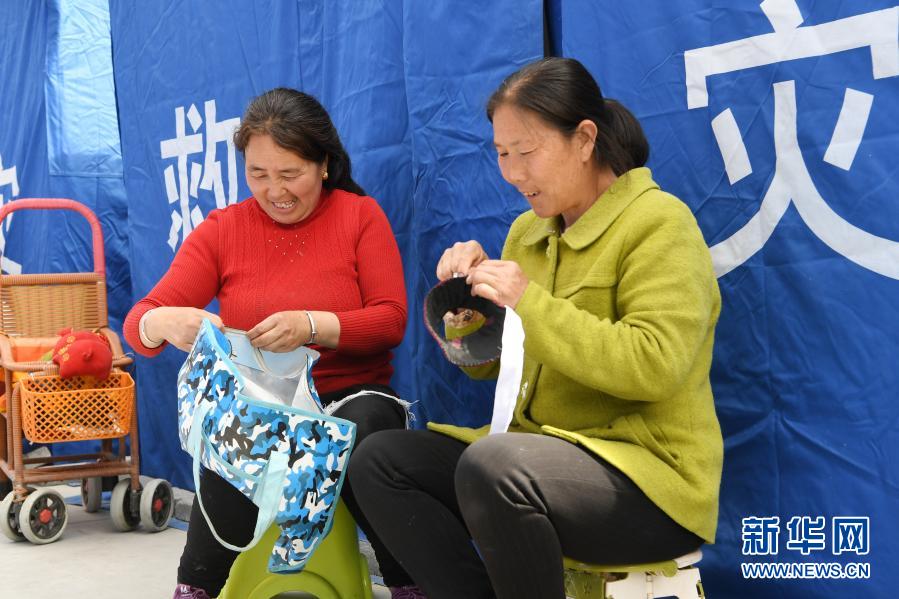 3月16日,在舟曲縣果耶鎮(zhèn)磨里村、果耶村滑坡災(zāi)害應(yīng)急避險臨時安置點,受災(zāi)群眾在帳篷外做針線。新華社記者 范培珅 攝