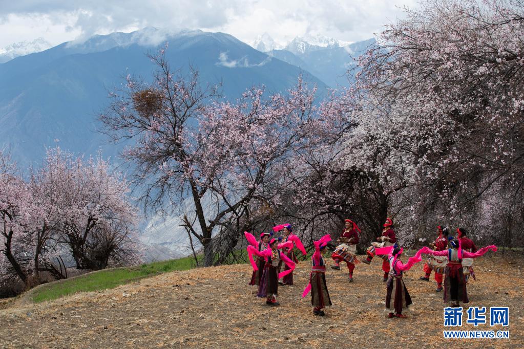 4月4日,在得榮縣徐龍鄉(xiāng)徐堆村,藏族群眾在桃花林下表演當(dāng)?shù)馗栉琛X(jué)央彈唱。新華社記者 江宏景 攝