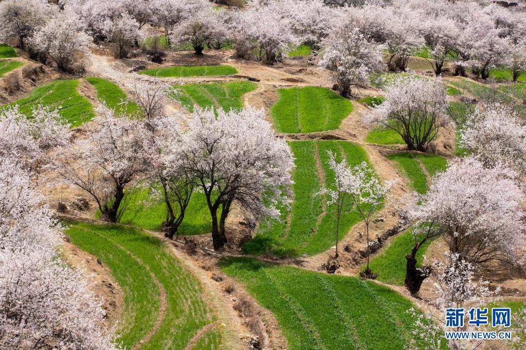 4月3日拍攝的得榮縣白松鎮(zhèn)日當(dāng)村桃花林一角(無(wú)人機(jī)照片)。新華社記者 江宏景 攝