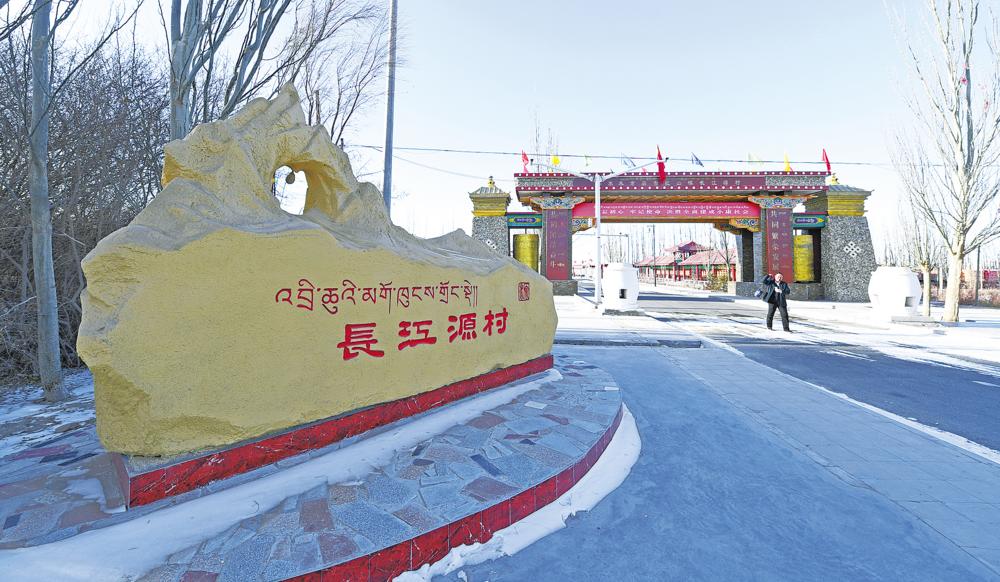 從格爾木市區(qū)沿109國道一路向南,車子行駛在廣闊平坦的公路上,窗外的景色緩緩?fù)撕蟆:鋈婚g,路旁一塊刻有“長江源村”字樣的巨石撲入眼簾,像一面破浪前行的風(fēng)帆,亦像一座拔地而起的豐碑,與一旁極具藏民族特色的大門交相輝映。站在村口放眼望去,一排排藏式風(fēng)格的庭院錯(cuò)落有致,屋頂上一面面五星紅旗獵獵招展,將湛藍(lán)的天空映襯得分外純凈。