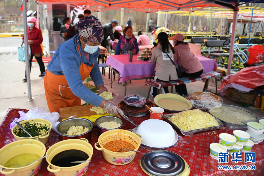 這兩天的貴德縣格外熱鬧,一簇簇雪白的梨花競相綻放,引得許多“踏春人”來這里“打卡”。在貴德縣水車廣場旁邊的小吃攤上,許元梅把一碗調(diào)好的釀皮端給顧客,忙完之后,她又給下一位顧客打包好一份酸奶。最近,貴德縣的游客漸漸多了起來,休息了一個冬天后,許元梅又支起了自己的小吃攤,為過往游客制作美食。