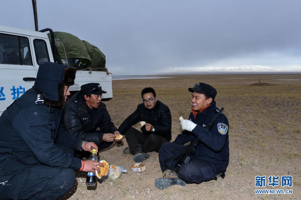 2014年12月26日,袁廣明(右二)和隊友進(jìn)入可可西里巡山吃飯。新華社記者 吳剛 攝