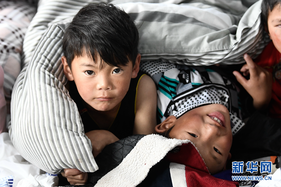 5月22日,在瑪多縣黃河鄉(xiāng)寄宿制學(xué)校救災(zāi)安置點(diǎn),孩子們?cè)谛菹?。新華社記者 張龍 攝