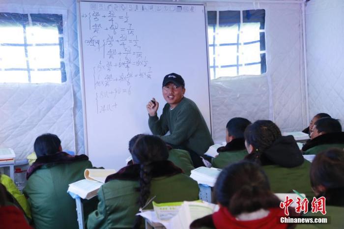 5月24日,瑪多縣民族寄宿制中學(xué)的老師在帳篷教室內(nèi)講課。當(dāng)日,青海省果洛藏族自治州瑪多縣學(xué)生復(fù)課。 中新社記者 馬銘言 攝