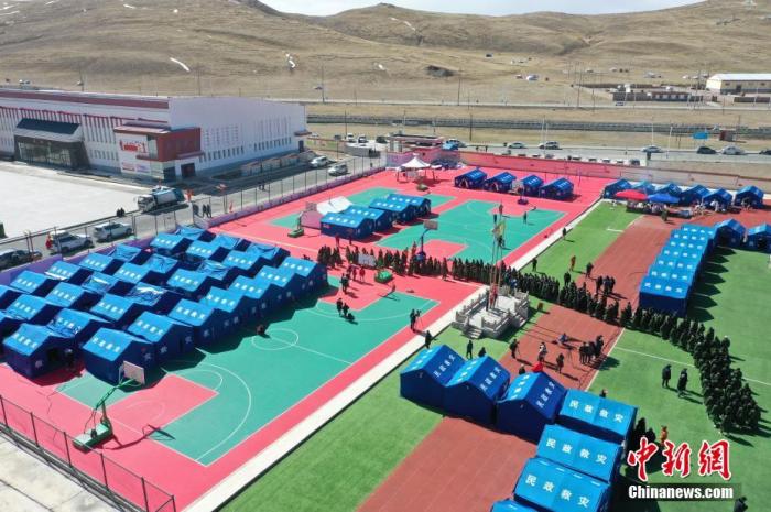 5月24日,瑪多縣民族寄宿制中學(xué)的師生們參加升旗儀式。當(dāng)日,青海省果洛藏族自治州瑪多縣學(xué)生復(fù)課。(無人機(jī)照片) 中新社記者 馬銘言 攝
