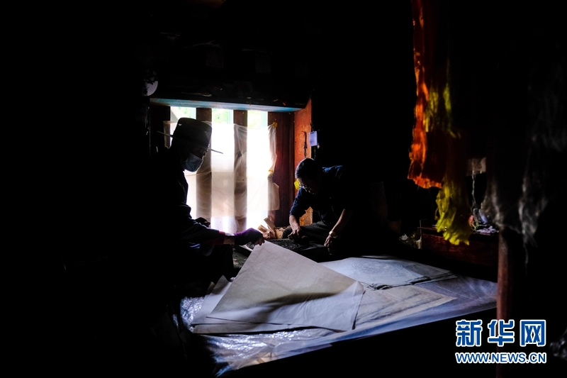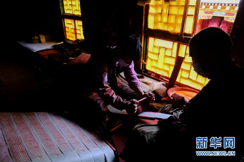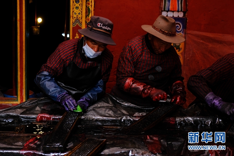 藏族雕版印刷非遺傳承人在校對木刻版。新華網(wǎng) 張可凡 攝