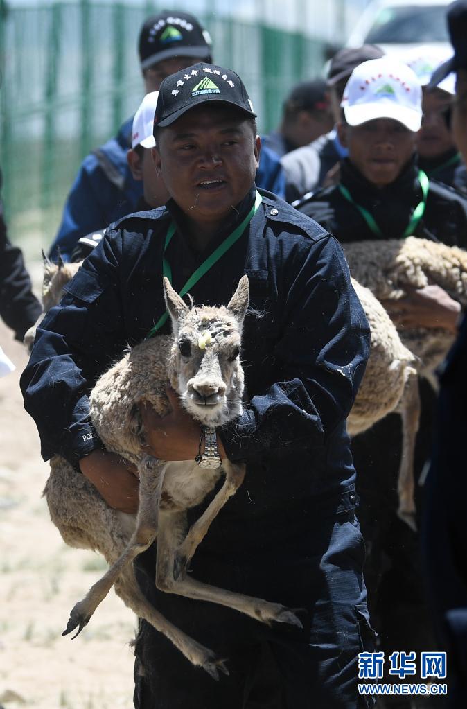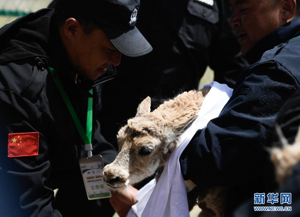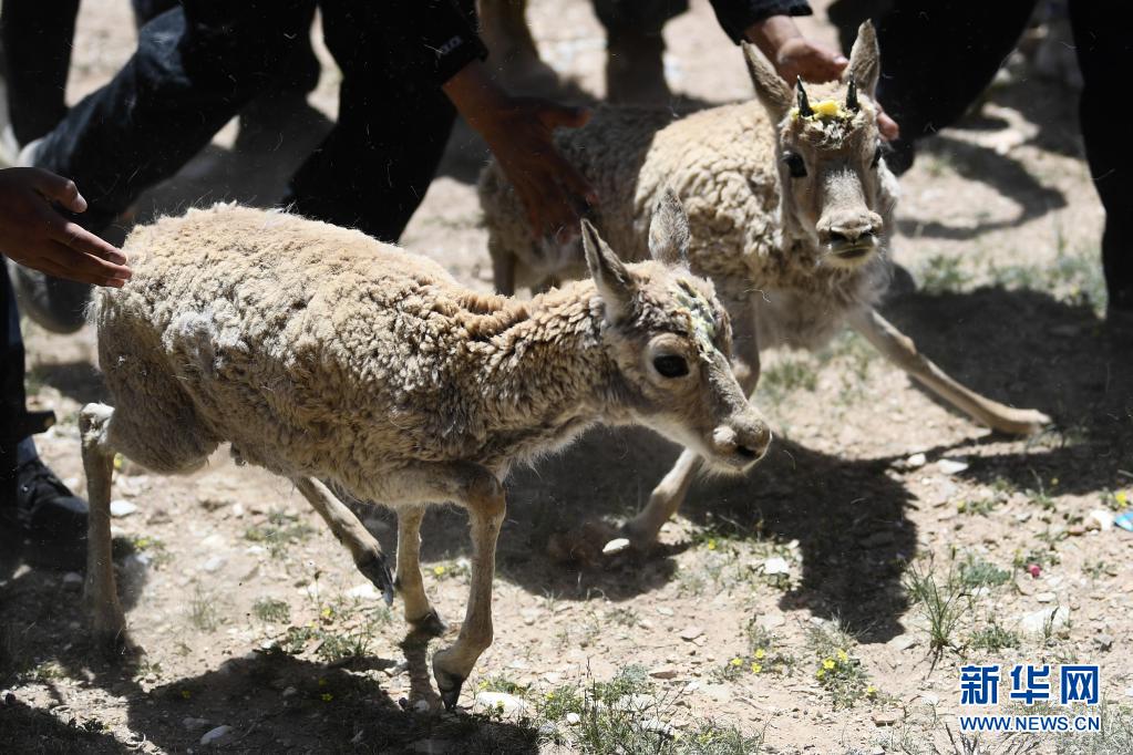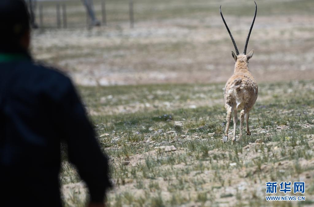 7月7日,在可可西里索南達杰保護站野生動物救助中心,藏羚羊被放歸大自然。新華社記者 張龍 攝