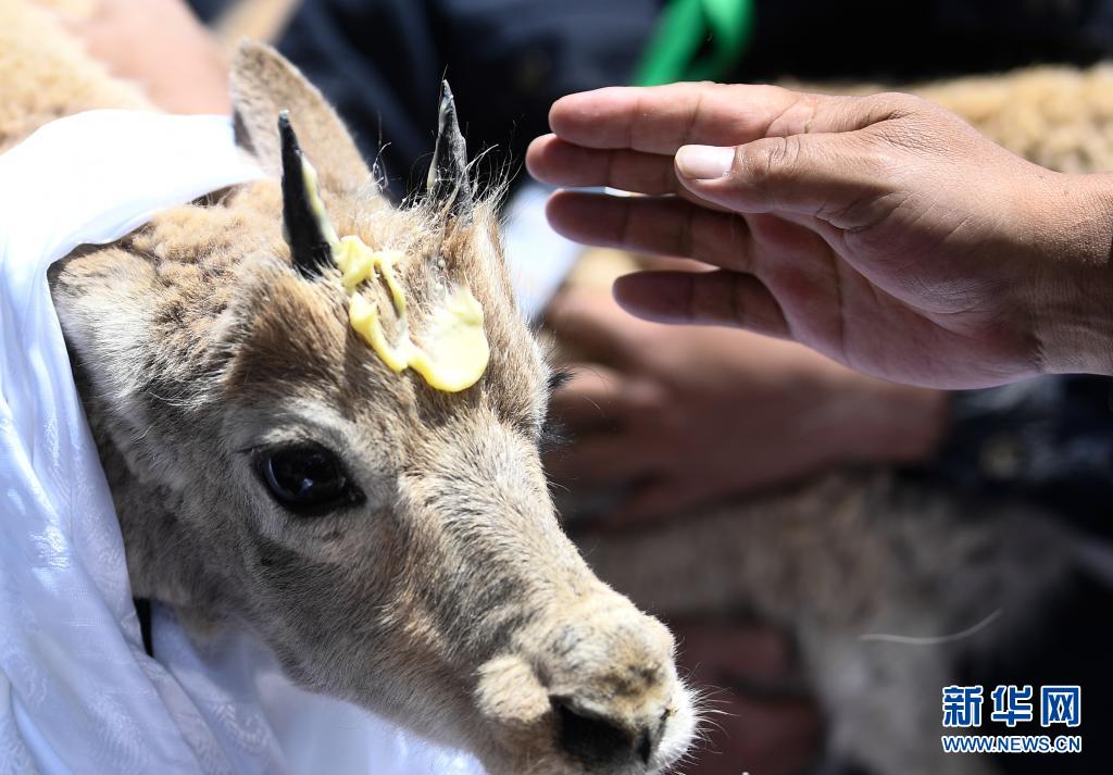 7月7日,在可可西里索南達杰保護站野生動物救助中心,可可西里巡山隊員按照風俗為放歸的藏羚羊戴上哈達表達祝福。新華社記者 張龍 攝