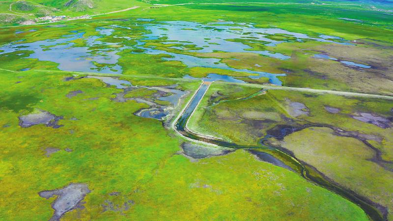 公路兩旁,青草織就的綠色地毯不斷鋪展,望不到邊,不時還能見到一個個水凼、沼澤或湖泊。這樣的景象,與2019 開始進場施工的若爾蓋濕地保護與恢復(fù)工程密不可分。措施之一,就是將之前開挖的排水渠填上,同時修建新的攔水壩蓄水。去年7月通過驗收的這項工程,總投資8880萬元,累計填堵排水溝35公里,恢復(fù)濕地水位6處,恢復(fù)濕地區(qū)域植被 6400 公頃,設(shè)置圍欄 78 公里。