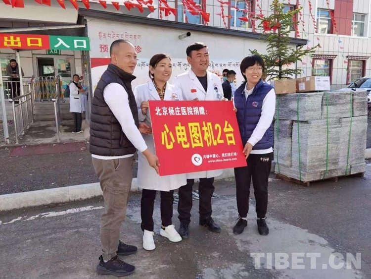 圖為馮亞靜和韓菲代表石景山楊莊醫(yī)院向久治縣醫(yī)院贈送兩臺心電圖機(jī)