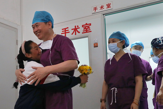 當(dāng)做完14臺手術(shù)的中國工程院院士、北京清華長庚醫(yī)院院長董家鴻從手術(shù)室走出來,旦正措趕緊上前,與董爺爺擁抱。