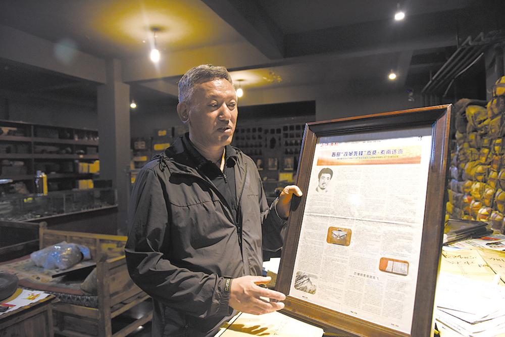 有些老報(bào)紙,索昂生格做成了相框,展出在鑄牢中華民族共同體意識(shí)主題展中,包括玉樹從解放初期到人民公社、從草場(chǎng)承包到改革開放、從改革開放到“四個(gè)現(xiàn)代化”建設(shè),從災(zāi)后重建到社會(huì)主義新玉樹各個(gè)階段。