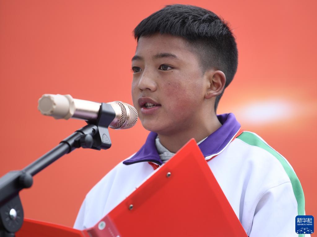 9月1日,在位于果洛藏族自治州瑪沁縣的瑪多地震災后過渡安置一校區(qū),學生科熱在國旗下講話。新華社記者 張龍 攝