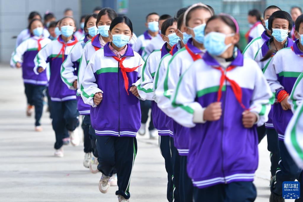 9月1日,在位于果洛藏族自治州瑪沁縣的瑪多地震災后過渡安置一校區(qū),學生在跑步。新華社記者 張龍 攝