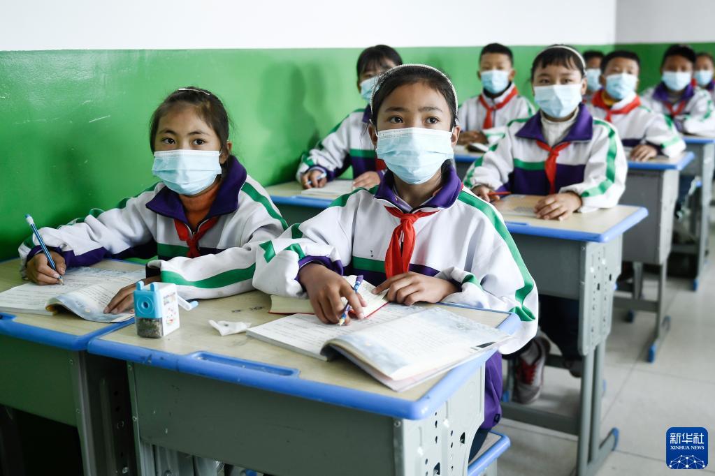 9月1日,在位于果洛藏族自治州瑪沁縣的瑪多地震災后過渡安置一校區(qū),學生在上開學第一課。新華社記者 張龍 攝