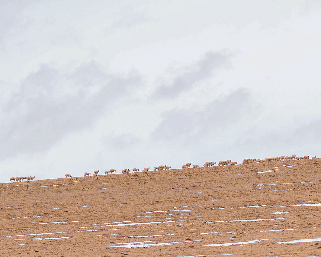 天上的措池,老村支書然西尕瑪望著漸行漸遠的藏羚羊群。