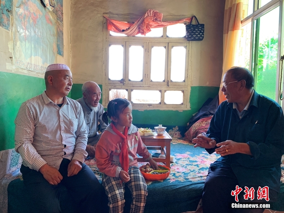 青海省海東市循化撒拉族自治縣白莊鎮(zhèn)來塘村一戶學(xué)生家,藏族教師完么仁增(右一)與學(xué)生家長(zhǎng)交流。中新社記者 馬銘言 攝