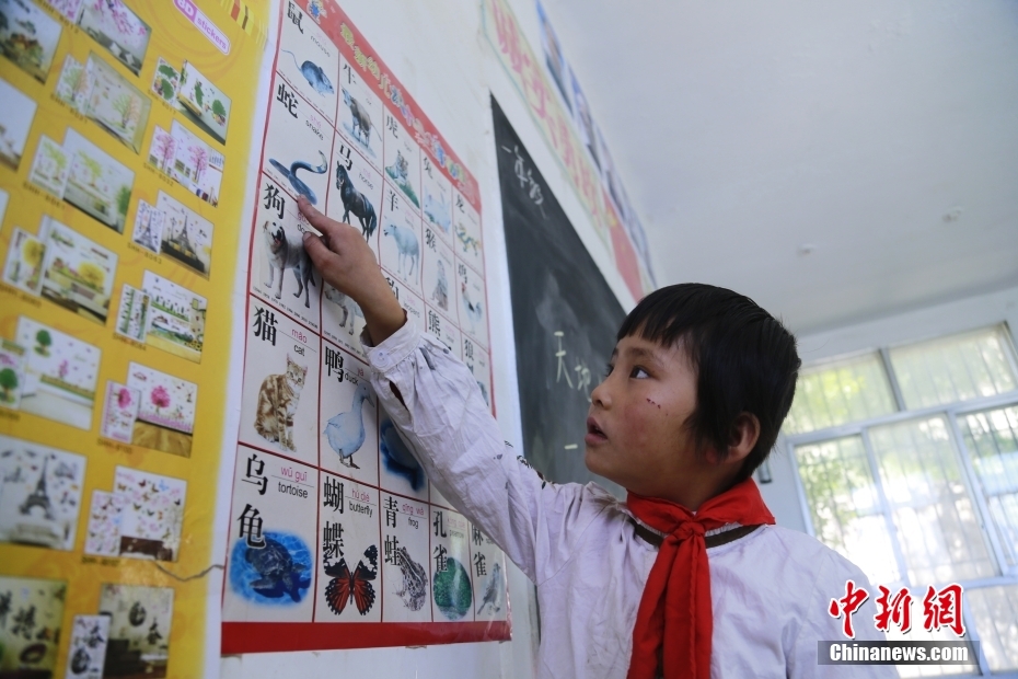 一名學(xué)生在看圖識(shí)字。中新社記者 馬銘言 攝