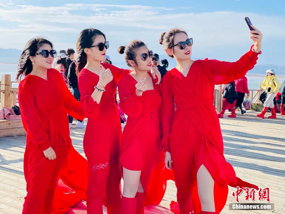 圖為游客們在茶卡鹽湖拍照。孫睿 攝