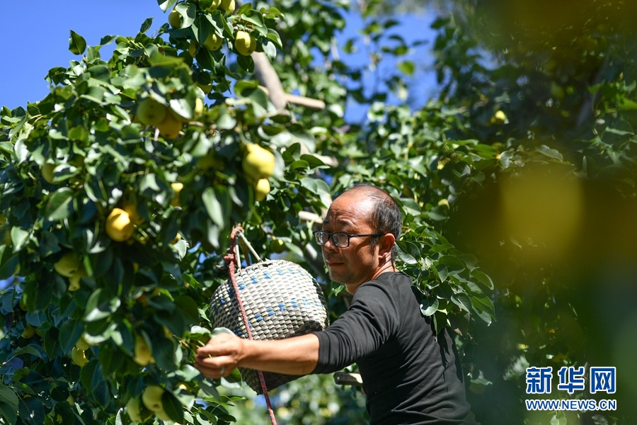 9月23日,貴德縣河東鄉(xiāng)下羅家村村民楊林春在自家的農(nóng)家院采摘長把梨。新華網(wǎng) 潘彬彬 攝