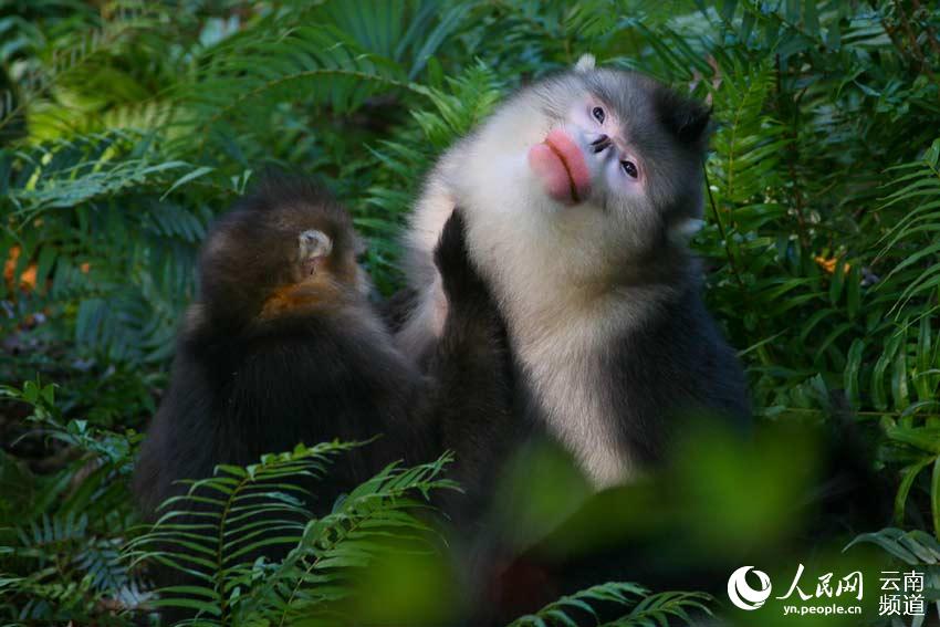余建華投下食物后,迅速吸引來一個名為“紅點”的滇金絲猴家庭?!斑@個家庭的雄性家長叫‘紅點’,是最有‘女人緣’的雄猴,曾有8只雌性對它表示好感,它收了6只做夫人?!?/p>