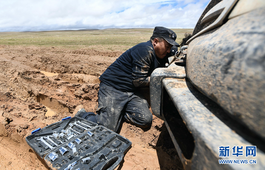 可可西里國(guó)家級(jí)自然保護(hù)區(qū)卓乃湖保護(hù)站站長(zhǎng)秋培扎西在可可西里地區(qū)修理車(chē)輛(2020年7月6日攝)。新華社記者 薛玉斌 攝