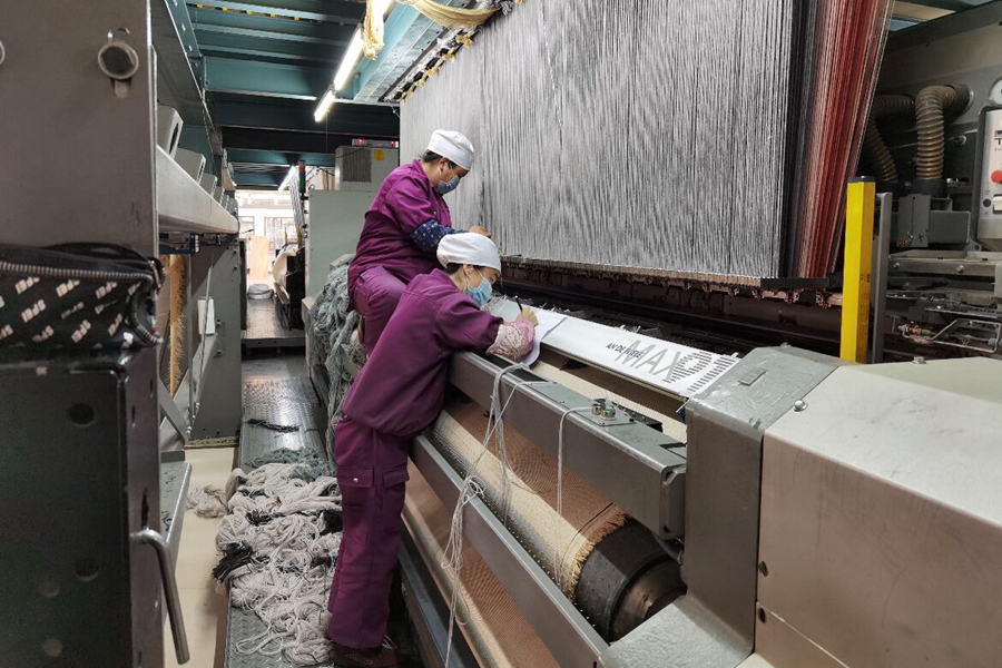這是在圣源地毯集團制作車間,工人們正在工作。新華網(wǎng)記者 潘子荻 攝