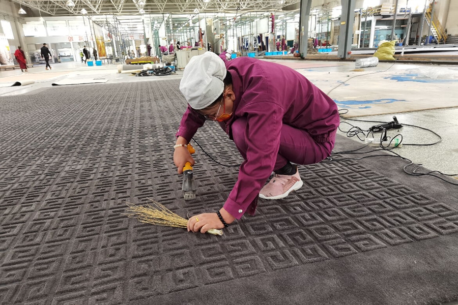 這是在圣源地毯集團制作車間,工人手工槍刺地毯。新華網(wǎng)記者 潘子荻 攝