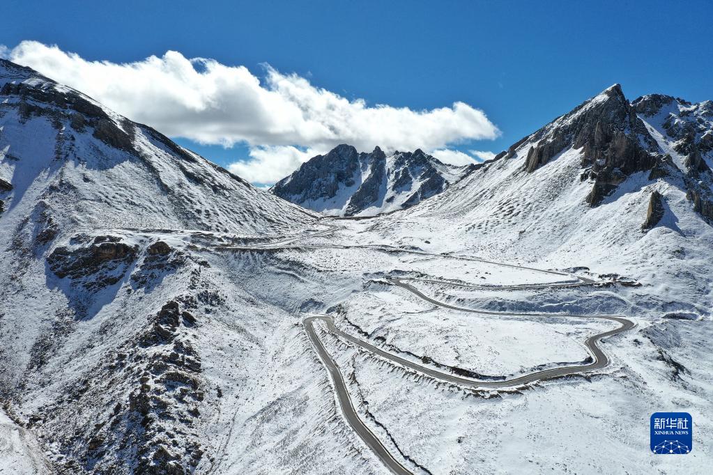 這是四川省甘孜藏族自治州巴塘縣境內(nèi)的通往藏巴拉雪山埡口的公路(10月23日攝,無(wú)人機(jī)全景照片)。新華社記者 胥冰潔 攝