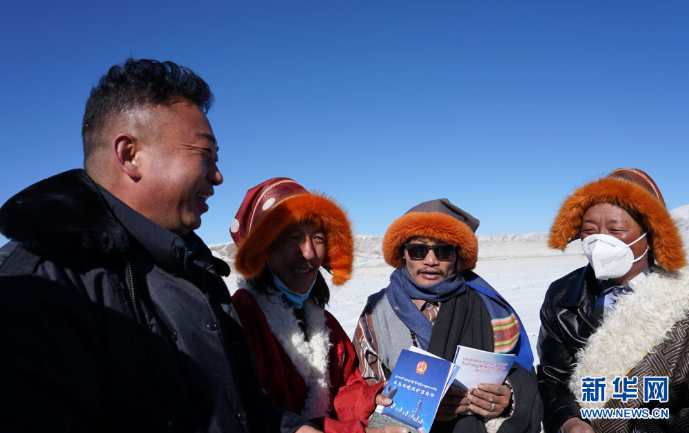 12月20日,青海省果洛藏族自治州瑪多縣人民法院院長(zhǎng)錢(qián)快乾(左一)在雪后草原上為當(dāng)?shù)啬羺^(qū)群眾普及法律知識(shí)。新華社記者 李寧 攝
