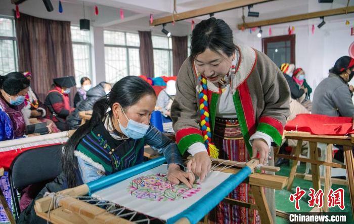 九龍縣手工藏毯編織技藝傳承人村仁拉粗(右)正在指導(dǎo)繡娘。劉忠俊 攝
