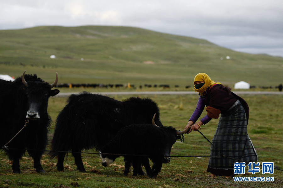 在果洛州瑪沁縣當(dāng)洛鄉(xiāng)貢龍村的夏季草場(chǎng)上,牧民在拴牦牛。(資料圖)新華社記者 張龍 攝
