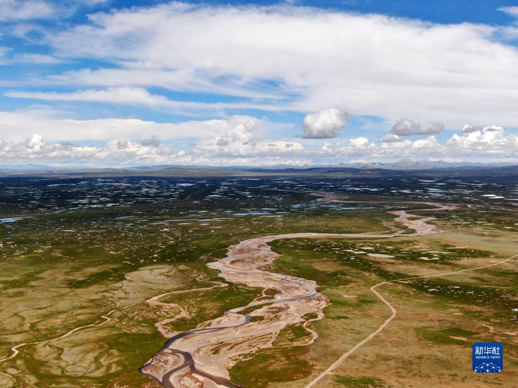 這是2021年7月23日拍攝的長(zhǎng)江源地區(qū)的查旦濕地(無(wú)人機(jī)照片)。新華社記者 張龍 攝