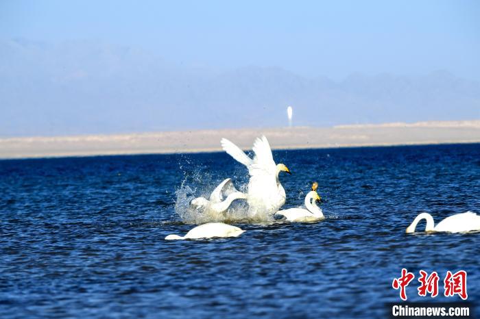 圖為天鵝群在湖中游蕩。青海多美生態(tài)環(huán)??萍加邢薰?供圖