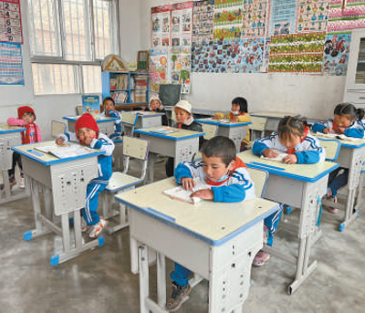 2017年,隨著易地扶貧搬遷政策的落實,越來越多村民選擇搬到山腳開始新的生活。學校里的孩子們由32名減少到9名?!?個孩子有7個是留守兒童,最大的8歲,最小的3歲?!蓖昝慈试霭押诎宸殖蓛蓧K,左邊是一年級,右邊是學前班,“安排了語文、數(shù)學、美術、道德與法治4門課,采用復式班的教學模式”。