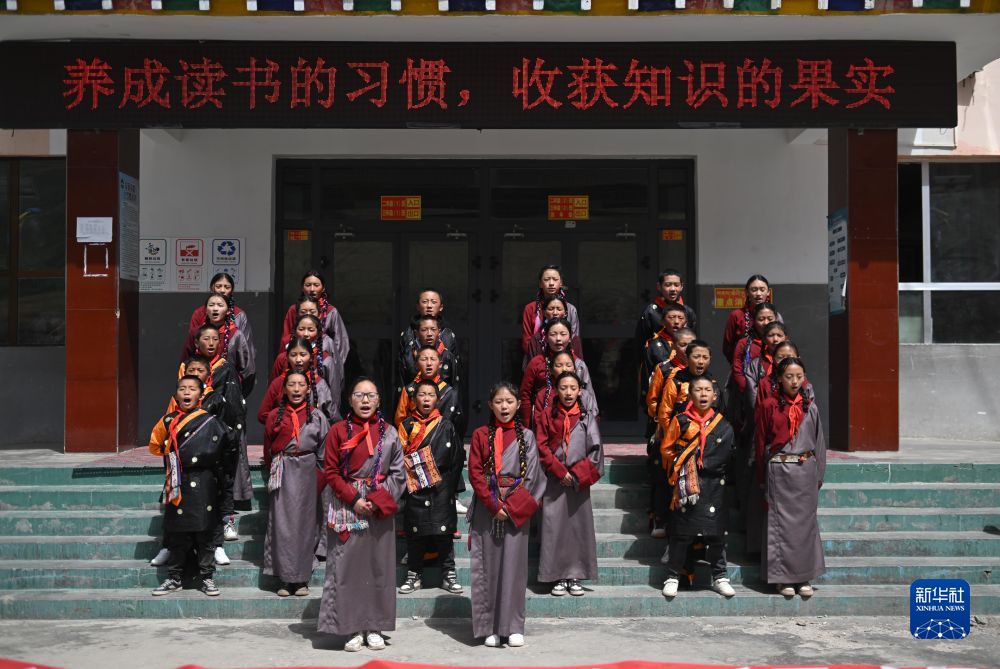 4月22日,青海省玉樹藏族自治州曲麻萊縣巴干鄉(xiāng)寄宿制小學(xué)的學(xué)生在學(xué)校組織的“世界讀書日”活動(dòng)中誦讀經(jīng)典。新華社記者 張龍 攝