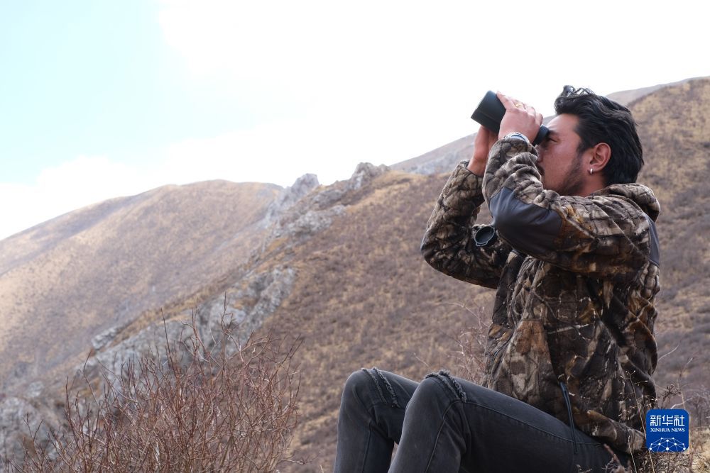 4月22日,生態(tài)管護(hù)員達(dá)杰用望遠(yuǎn)鏡觀(guān)察對(duì)面山上的野生動(dòng)物。新華社記者 央秀達(dá)珍 攝