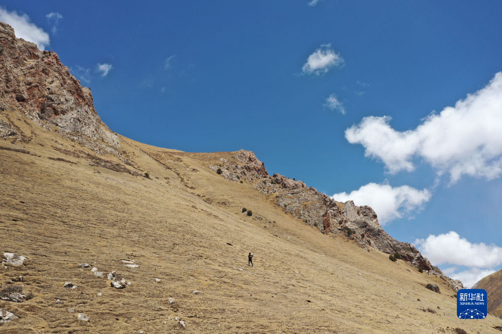 4月22日,生態(tài)管護(hù)員達(dá)杰在巡山(無(wú)人機(jī)照片)。新華社記者 韓方方 攝