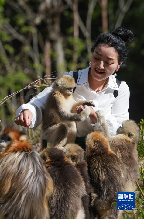 4月26日,在四川白河國家級自然保護(hù)區(qū)里,工作人員與川金絲猴在一起。新華社記者 江宏景 攝