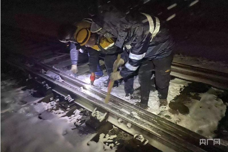對尖軌與基本軌之間夾雪部位進行清掃。央廣網(wǎng)發(fā) 余國棟 攝