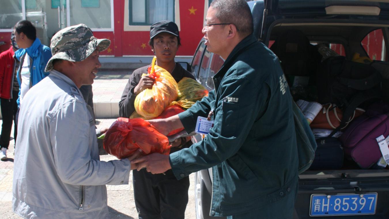 葛軍為“鴻雁天路”沿線牧民捎帶物資。中國(guó)郵政格爾木分公司供圖