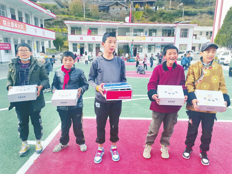 去年11月12日,在九龍縣三巖龍鄉(xiāng)小學(xué),由青白江區(qū)彌牟鎮(zhèn)物流商會(huì)捐贈(zèng)的86雙加絨運(yùn)動(dòng)鞋送到了學(xué)生們的手中。三巖龍鄉(xiāng)平均海拔3300米,冬季氣溫低,“這下不用擔(dān)心學(xué)生們凍腳了。”該校校長駱朝文說。