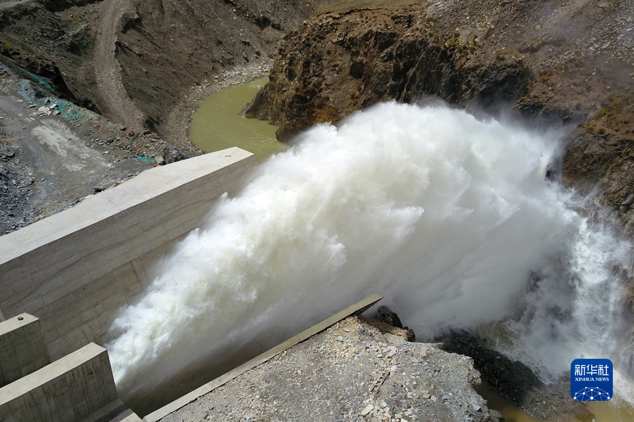 這是6月8日在青海省海西蒙古族藏族自治州德令哈市境內(nèi)拍攝的蓄集峽水庫(kù)放空洞泄流景象(無(wú)人機(jī)照片)。新華社記者 范培珅 攝