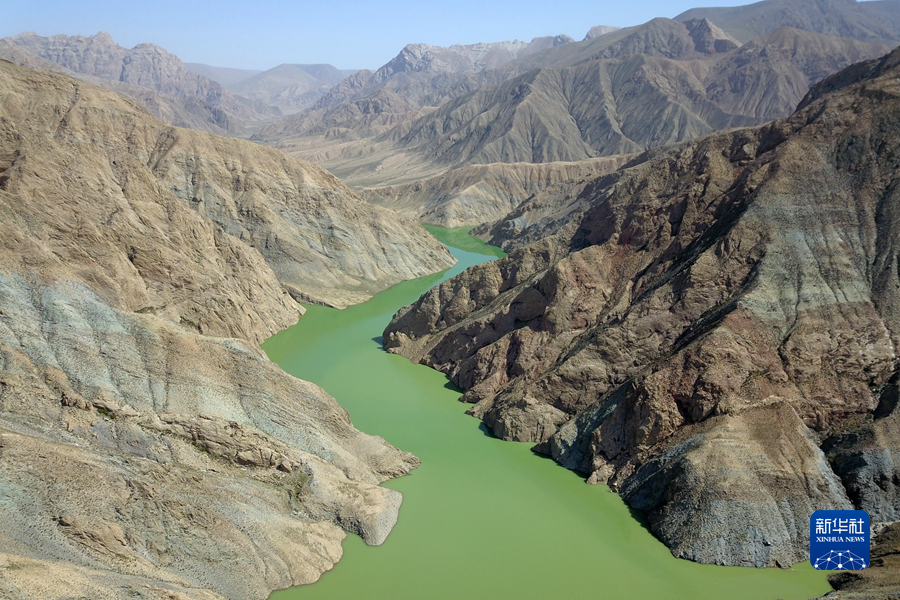 這是6月8日在青海省海西蒙古族藏族自治州德令哈市境內(nèi)拍攝的蓄水中的蓄集峽水庫(kù)(無(wú)人機(jī)照片)。新華社記者 范培珅 攝