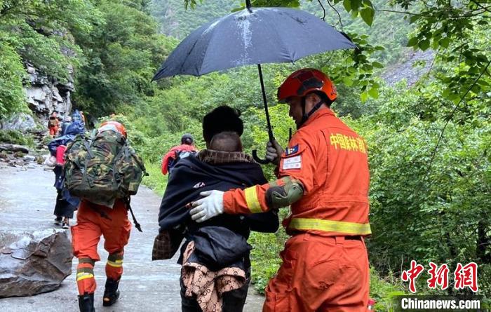 四川森林消防員撐起傘在雨中護送群眾轉移。四川森林消防供圖