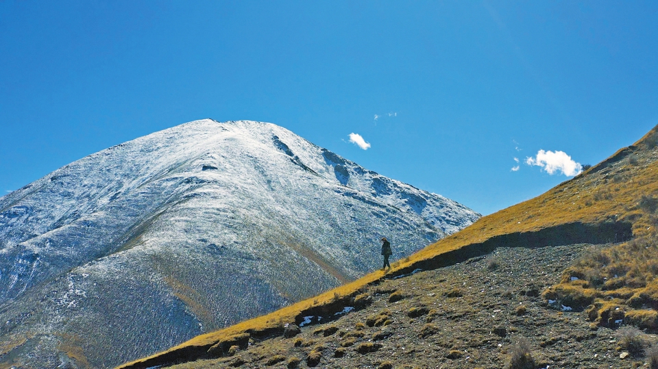 在世界屋脊研究野生動物,免不了直面挑戰(zhàn)。雪豹喜歡陡峭的石壁和山崖,因此安放紅外相機(jī)必須克服恐高心理。2021年10月,在云塔村爬山布設(shè)紅外相機(jī)時,我為了緊跟隊伍,沒來得及觀察周圍環(huán)境。當(dāng)穿過灌木到達(dá)監(jiān)測位點時,才發(fā)現(xiàn)自己站在山脊線上,背后就是幾十米高的斷崖,立馬嚇得眩暈蹲下。檢查并重新安裝好紅外相機(jī)后,我們又爬完兩座山才完成了一天的工作。這一趟,我們創(chuàng)造了為追逐雪豹一天內(nèi)翻越3座山的紀(jì)錄。