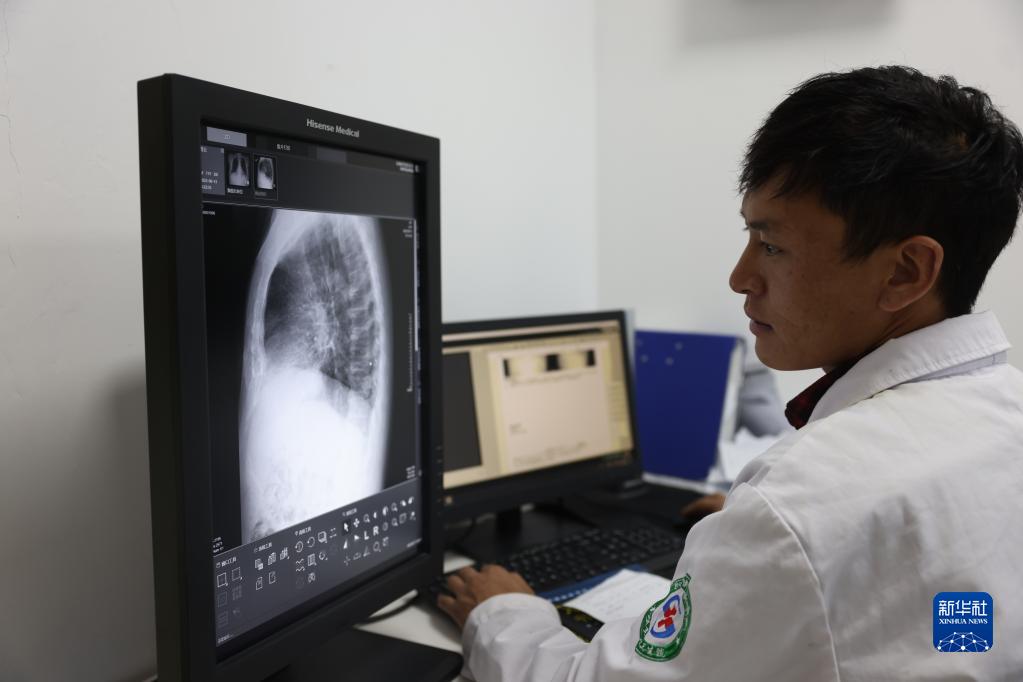 6月13日,在青海省果洛藏族自治州甘德縣青珍鄉(xiāng)中心衛(wèi)生院,醫(yī)生才讓巴丁正在查看X光片。新華社記者 李寧 攝