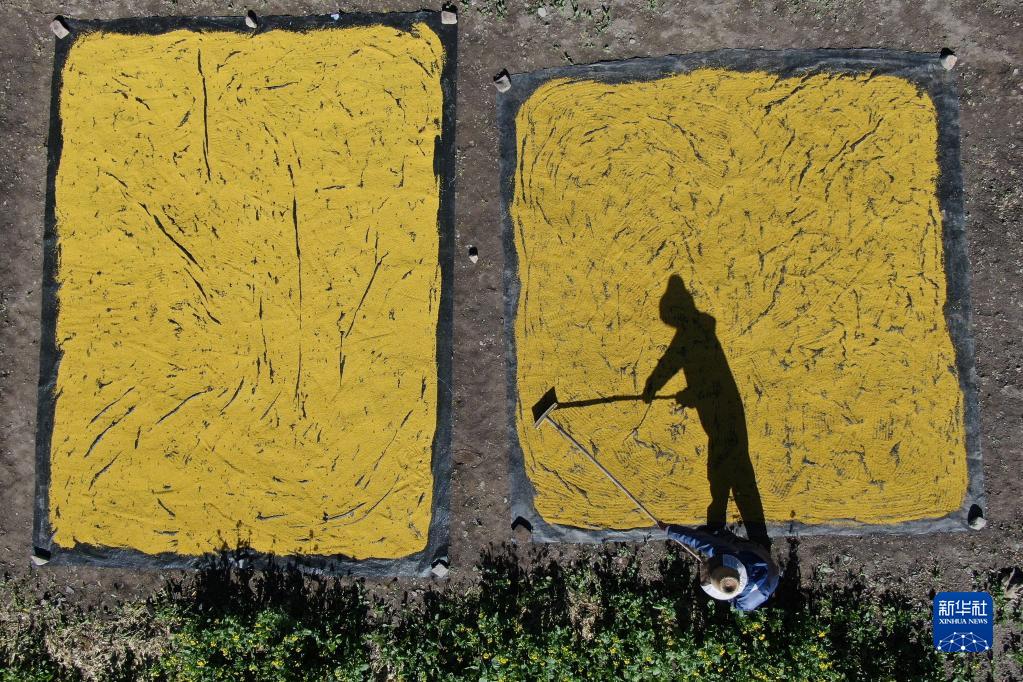 7月2日,在青海省海北藏族自治州門源回族自治縣,馮躍宣在晾曬花粉(無人機(jī)照片)。新華社記者 張龍 攝