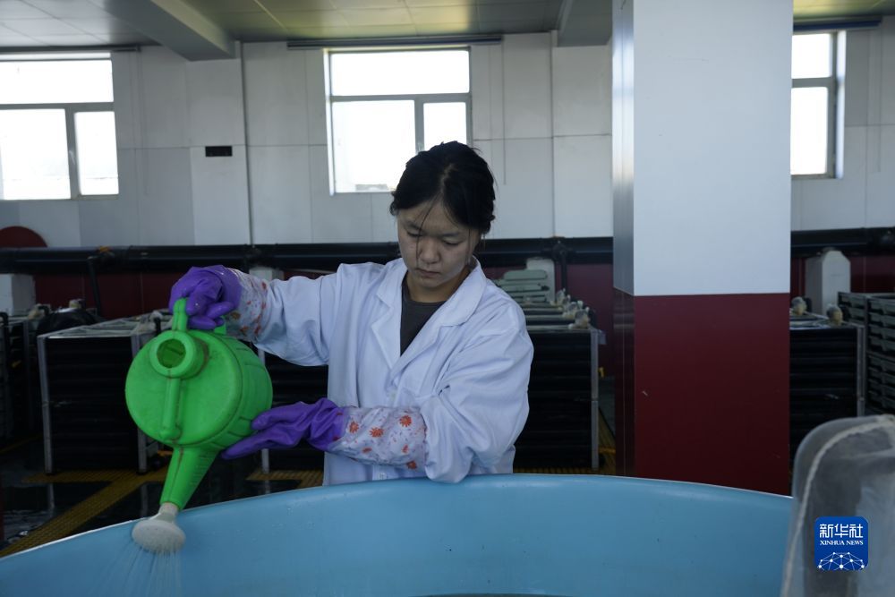 7月6日,青海湖裸鯉救護(hù)中心沙柳河泉吉河增殖實(shí)驗(yàn)站的技術(shù)人員在為小魚(yú)苗喂食。新華社記者 陳杰 攝