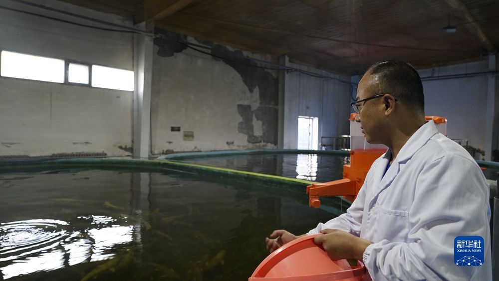 8月8日,青海湖裸鯉救護(hù)中心的工作人員為繁育車間里的湟魚(yú)喂食。新華社記者 陳杰 攝